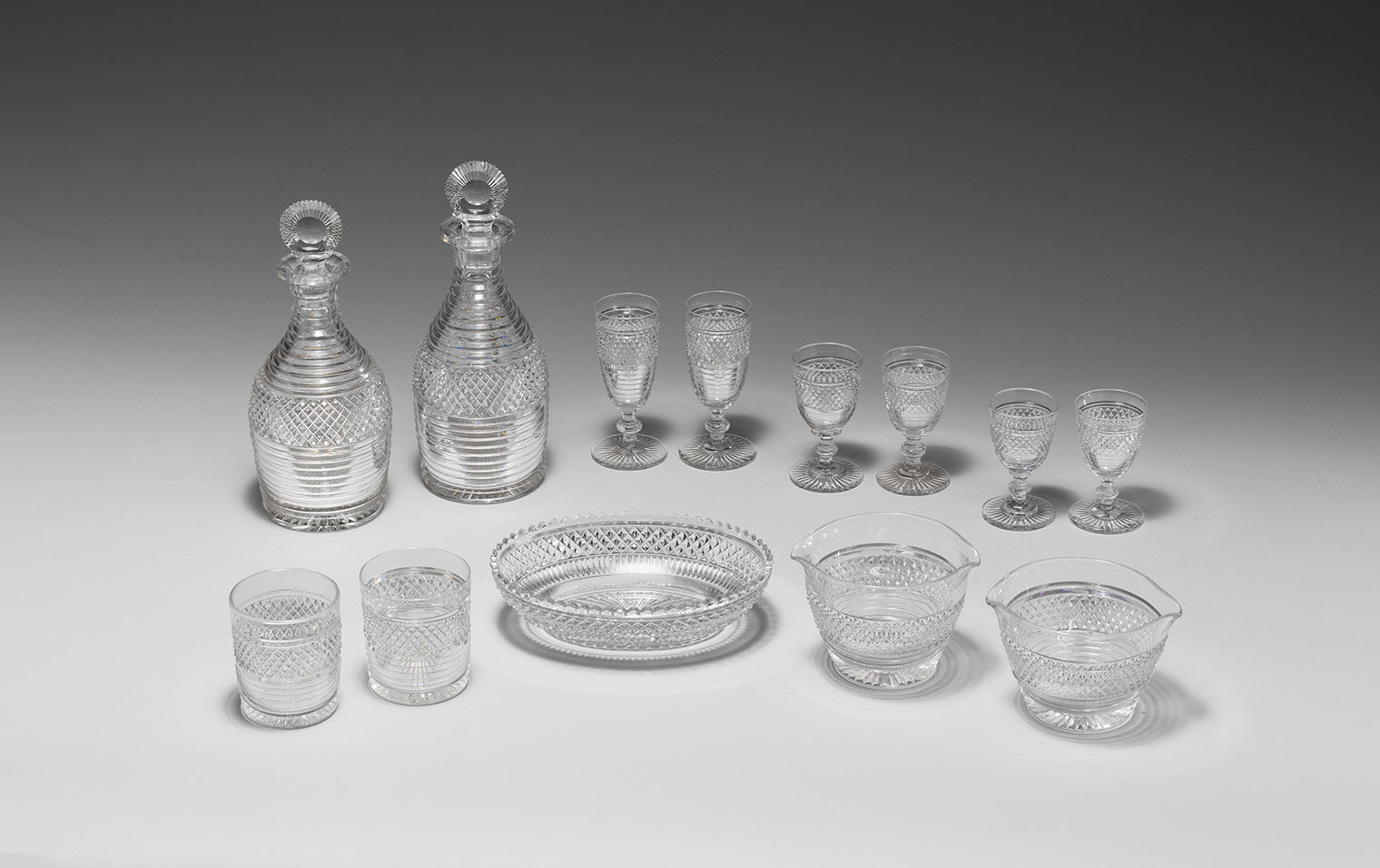 William Bayard (1761–1826) commissioned this table service in 1818 for his daughter Harriet (1799–1875) and her husband Stephen Van Rensselaer IV (1789–1868) from Pellatt & Green, London's premier glasshouse. The fine lead glass and deep Regency cutting would have created a brilliant sparkle in their candlelit dining room in Albany, New York. The set originally included dozens of drinking glasses for claret, ale, and champagne, as well as decanters, wine coolers, tumblers, and finger glasses—all "elegantly cut in diamonds & Rings" according to the surviving bill of sale. In addition to its elegance and quality, the service is extremely rare in its documentation of the specific American family that owned it and to the English glasshouse that made it.