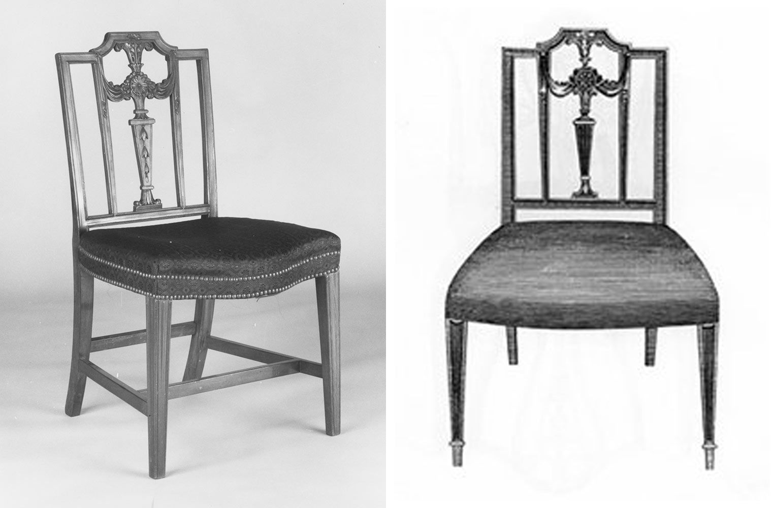 Left: Possibly by Henry Ingle (American, 1763–1822). Side chair (one of twelve), 1795–1810. Washington, D.C.. Mahogany with oak, tulip poplar, yellow pine, maple, 36 3/4 x 20 x 20 in. (93.3 x 50.8 x 50.8 cm). The Metropolitan Museum of Art, New York, Bequest of Flora E. Whiting, 1971 (1971.180.16-.27). Right: Plate from George Hepplewhite's Cabinet-Maker and Upholsterer's Guide (1788)