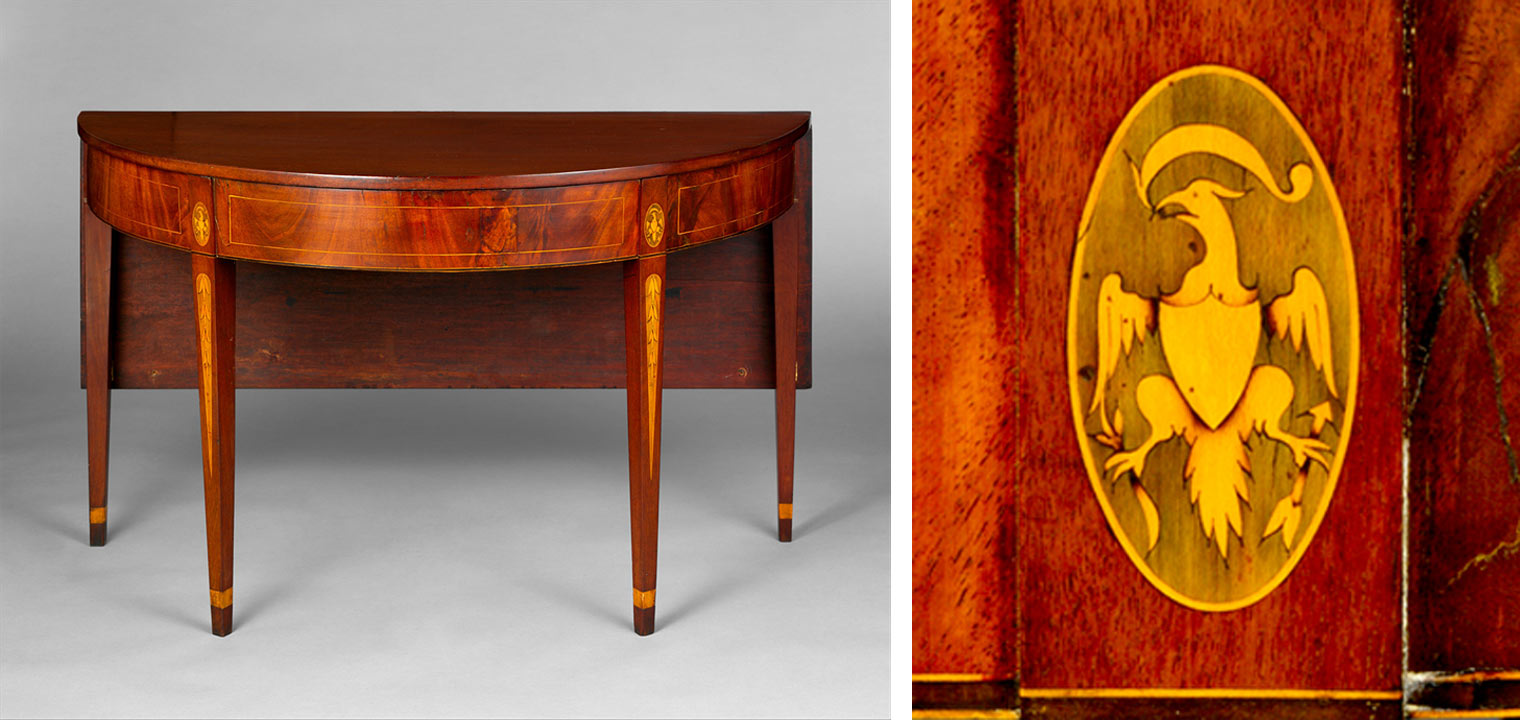 Left: Drop-leaf dining table (one a pair), 1795–1810. Baltimore. Mahogany, holly with tulip poplar, white pine, sycamore, 28 1/2 x 47 7/8 x 39 1/4 in. (72.4 x 121.6 x 99.7 cm). The Metropolitan Museum of Art, New York, Rogers Fund, 1919 (19.13.1, .2). Right: Much of the detail of the marquetry eagle was lost through refinishing before the Museum acquired the table