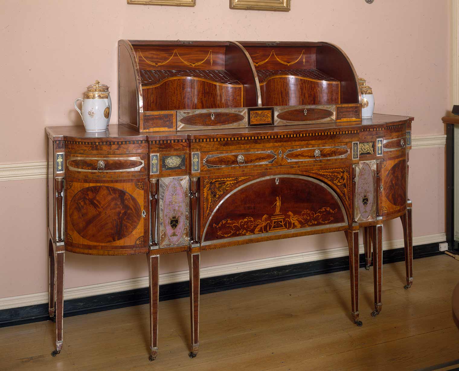 Many of the motifs found in the sideboard's panels of marquetry and verre églomisé were taken directly from Thomas Sheraton's Cabinet-Maker and Upholsterer's Drawing-Book (1793). Sheraton (1751–1806), an English cabinetmaker and drawing instructor, influenced numerous American furniture manufacturers through this publication, which was imported all along the eastern seaboard.