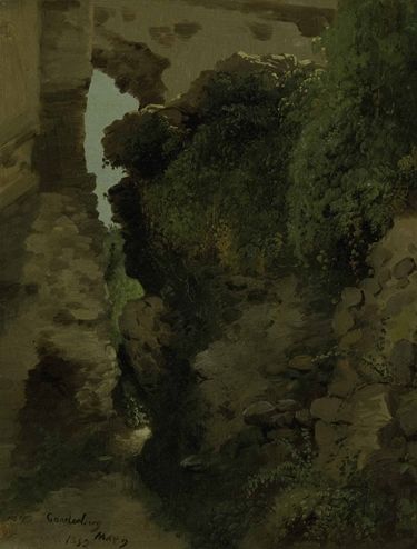 The younger brother of landscape painter William Hart, James Hart began his career as a coach and sign painter in Albany, New York. In 1850, he departed for Europe to advance his artistic training, studying first in Munich and then in Düsseldorf under the tutelage of German landscape painter Friedrich Wilhelm Schirmer. While abroad, Hart completed several on-the-spot landscape sketches, including these two oil studies. The inscription "Goadesberg" on his sketch from May 9, 1852, is probably a reference to the town Bad Godesberg, located on the Rhine River where Hart executed this freely painted vignette of an overgrown rocky landscape. He also painted vibrant views in the Alps, including Mountain Range, a brightly colored sunset scene likely depicting the Tyrol. After three formative years overseas, Hart returned to New York, where he continued to paint landscapes, specializing in bucolic scenes with cattle, oxen, and other farm animals.