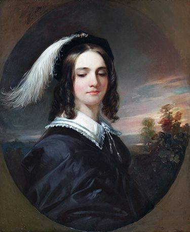This portrait of Mary Inman (1827–1860) has been known by several titles, including "The Artist's Daughter," "The White Plume," and "Beatrice." When first acquired by the Museum, it was mistakenly attributed to the sitter's father, the artist Henry Inman, but has since been identified as being by Inman's student and close friend, Daniel Huntington, who likely painted it as a gift for his teacher. With her plumed hat and cloak, Mary may be portrayed in the guise of the witty and free-spirited Beatrice from Shakespeare's As You Like It. The loosely painted landscape in the background evokes the romanticism of Shakespeare's work that resonated with the spirit of the Gothic Revival.