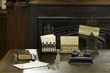 Image: Letter holders, inkwell, and reading glasses on view in the Gothic Revival Library.