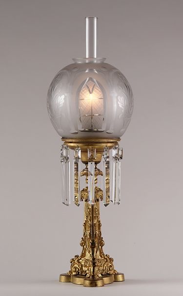This table-top lamp utilizes a variation of the oil-burning lighting technology advanced by the eighteenth-century Swiss chemist Amie Argand. The small oil reservoir and wick at the top are enclosed in a frosted-glass shade etched with pointed arch windows alternating with baskets of flowers. The gilt-bronze base features Gothic decoration, such as arches and sprockets. The dangling crystals further enhanced the dazzling effects of this fixture.