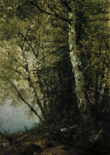 This oil study is one of thirty-eight works found in John Frederick Kensett's studio after his death in the summer of 1872. Collectively known as "The Last Summer's Work," these paintings were donated to The Met by the artist's brother, Thomas Kensett, in 1874. The title of this work is evidently a misnomer, as the trees are not beeches but birches with their characteristic white bark and thin leaves. The study's small scale and rapid brushwork indicate that Kensett was likely working en plein air, possibly on the shores of Lake George, where he executed several landscapes throughout his career (see, for example, 15.30.61 and 74.12). On-the-spot sketches such as this informed Kensett's finished studio oils, many of which include detailed renderings of shoreline trees and foliage.