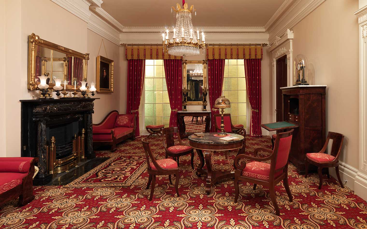 As was popular in the day, the smooth plastered walls are painted a warm beige. Paint analysis was conducted on extant New York interiors of the time, such as Colonnade Row (1832) on Layfayette Street, which helped the curators decide on an appropriate period color. A modern reproduction of a wall-to-wall Brussels (looped pile) carpet was laid on the floor. Its design was accurately woven from an 1827 watercolor point paper pattern found in the archives of an English carpet mill. The original colors specified for the five-color wool carpet were blue, white, light drab, black, and dark drab, but the written instructions on the point paper for several other colorway possibilities inspired the curators to weave it in a classic red and gold combination to match the coverings on the furniture.