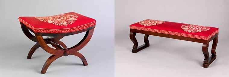 Left: Attributed to the Workshop of Duncan Phyfe (American, born Scotland 1770–1854) or D. Phyfe & Sons (1837–40). Taboret. New York, ca. 1837. Mahogany, ash, modern upholstery. The Metropolitan Museum of Art, New York, Purchase, L. E. Katzenbach Fund Gift, 1966 (66.221.7) Right: Attributed to the Workshop of Duncan Phyfe (American, born Scotland 1770–1854) or D. Phyfe & Sons (1837–40). Window seat. New York, ca. 1837. Mahogany, ash, pine, modern upholstery. The Metropolitan Museum of Art, Purchase, L. E. Katzenbach Fund Gift, 1966 (66.221.10)