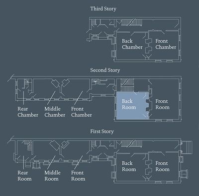 According to insurance surveys taken in 1769 and 1785, the Powels' "Main House" had three stories, with a garret attached to a two-story back building. As was fashionable in England, the principal rooms were on the second story, where the absence of an entrance from the outside translated into maximum space. These rooms were also removed from the odors and dirt of the street, as well as the heat and smoke of the kitchen.