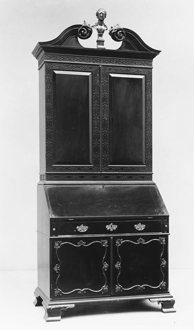 Among the most impressive forms of American furniture, the desk and bookcase was a symbol of its owner's mercantile and intellectual achievements. On this example, a carved finial bust of a young woman, likely a literary figure, emerges from the broken-scroll pediment at the top. The square-paneled doors of the bookcase and slat-front top of the desk open to reveal shelves, cubbyholes, and slots for the storage of documents, books, and correspondence.