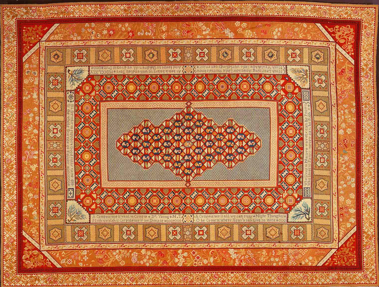 Rugs and carpets were a considerable luxury in colonial America. Until the mid-eighteenth century, owners spread valuable imported rugs over tables rather than subjecting them to wear on floors. However, the size of this large, cross-stitched English carpet, decorated with floral and geometric motifs, indicates that it was intended for the floor. There are quotations from Edward Young's Night Thoughts (1742–45), a popular poem about life, death, and immortality, stitched into one of the carpet's inner borders.