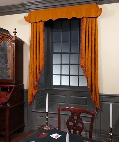 The room's window valances are also made of reproduction fabric. Their shape and style were copied from valances given by the Verplanck family in 1939.