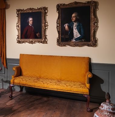 The inspiration for the room's upholstery and window hangings is a fabric once owned by the Verplancks. Descendants donated the pumpkin-colored eighteenth-century wool damask to the Museum in 1941. Curators used this original material to upholster the furniture when the room was first installed. After the eighteenth-century fabric wore out in the 1960s, it was replaced with the reproduction fabric that is still in use today.