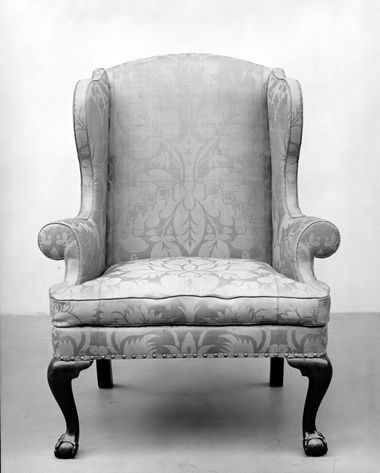 An easy chair was the product of two different craftsmen. The chair maker built the wood armature that determined the chair's basic outline, while the upholsterer determined its ultimate shape. Although the C-scroll arms are typical of Philadelphia work, this chair was produced in New York City. The secondary woods are common in New York–made furniture, as are the square rear legs and the method of joining the seat rails to the front legs. In addition, the claw-and-ball feet—distinguished by a squashed ball with narrow, downward-sloping talons—are distinctively New York.