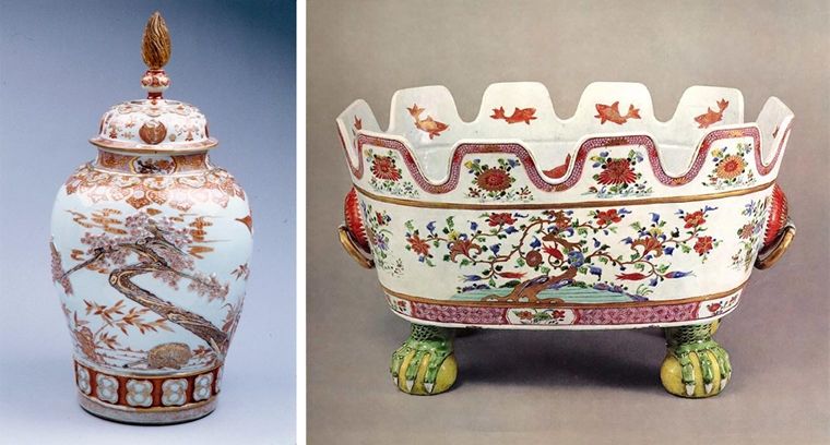 Left: Hearth jar (one of a pair), 1750–90. China. Porcelain. The Metropolitan Museum of Art, New York, Purchase, Rogers Fund and Gift of Mrs. Russell Sage, by exchange, 1971 (1971.140.1a–c). Right: Monteith, early 18th century. China. Porcelain painted in overglaze famille verte enamels and gilt. The Metropolitan Museum of Art, New York, Gift of Mrs. Harry Payne Bingham, 1974 (1974.369.8)