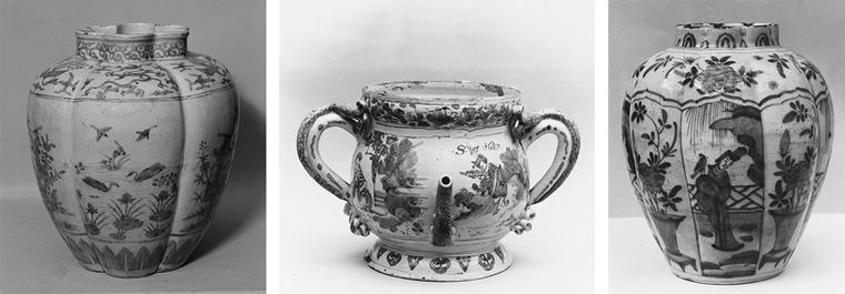 Left: Jar. Chinese. Porcelain. The Metropolitan Museum of Art, New York, Rogers Fund, 1921 (21.12.9); Center: Lambeth Factories [British]. Posset Pot, ca. 1687. Made in London, England. Tin-enameled earthenware. The Metropolitan Museum of Art, New York, Gift of Mrs. Russell S. Carter, 1946 (46.64.15); Right: Jar, 1700–1720, Dutch, Made in Delft, Netherlands. Earthenware. The Metropolitan Museum of Art, New York, Rogers Fund, 1926 (26.25.6)