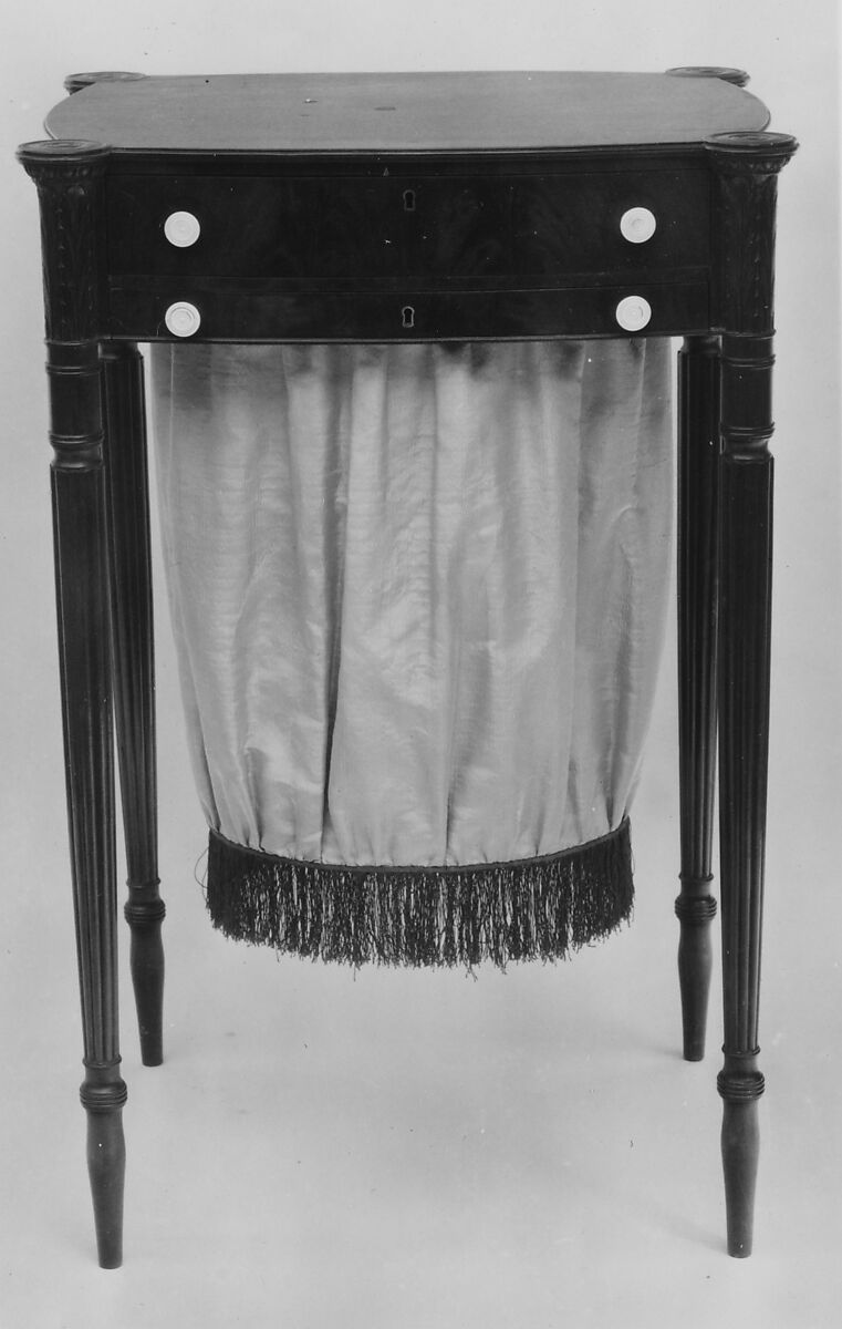 Worktables were one of several gender-specific forms produced in the Federal period. The silk fringed bag was for storing sewing supplies, the upper drawer, fitted with compartments, held items for writing. The leaf-covered turret cornices and tapering turned and reeded legs with a drum at the top and elongated, swelled feet are characteristic of Salem Federal-period table forms. The earliest documented use of the word “worktable” in Salem is in 1807, when the cabinetmaking partnership of Elijah and Jacob Sanderson paid Samuel McIntire three dollars for “Reeding & Carving 4 legs for [a] worktable.”