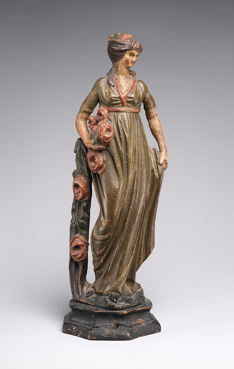 Personifications of the four seasons were common subjects for engravers and printmakers in the eighteenth century, but carved wood statuettes such as these are exceedingly rare. In this set of figurines (1971.180.83-.86), the seasons are identified by their attributes: Spring by flowers, Summer by wheat, Autumn by a basket of fruit, and Winter by a muff. Other than for ships’ figureheads, there was little demand in the United States for sculptural carving during this time period. The surviving examples of non-maritime wood sculpture originated almost exclusively in Boston or Salem, Massachusetts.