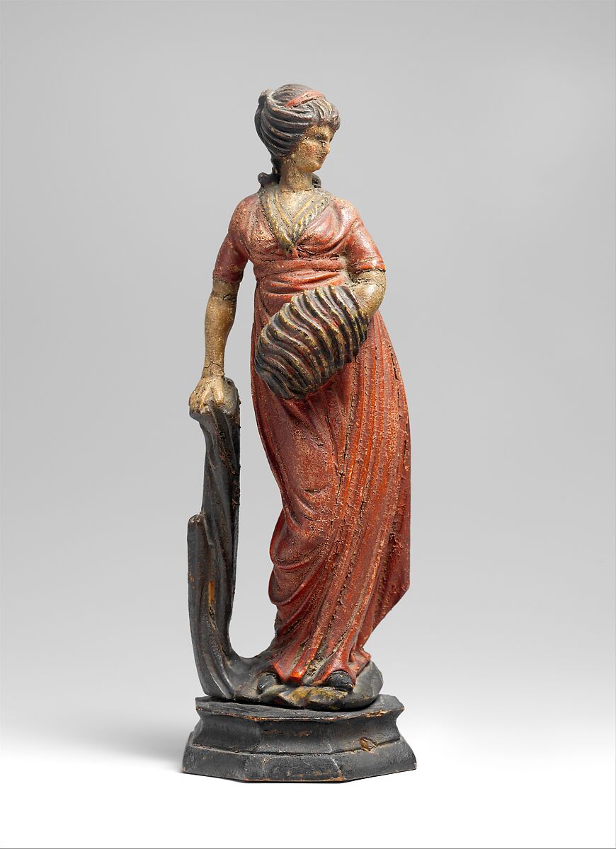 Personifications of the four seasons were common subjects for engravers and printmakers in the eighteenth century, but carved wood statuettes such as these are exceedingly rare. In this set of figurines (1971.180.83-.86), the seasons are identified by their attributes: Spring by flowers, Summer by wheat, Autumn by a basket of fruit, and Winter by a muff. Other than for ships’ figureheads, there was little demand in the United States for sculptural carving during this time period. The surviving examples of non-maritime wood sculpture originated almost exclusively in Boston or Salem, Massachusetts.