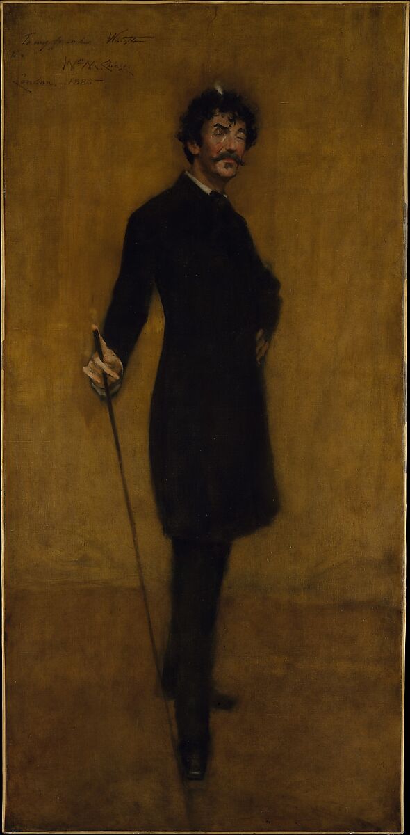 On his way to Spain by way of London in 1885, Chase decided to introduce himself to James McNeill Whistler (1834–1903), whose art he had long admired. Whistler urged him to stay longer so they could paint portraits of one another. In depicting Whistler, Chase echoed characteristics of his subject’s recent portraits, such as that of Théodore Duret (13.20): a stylized figure, muted palette, fluid brushwork, and ambiguous space. Although Chase intended to honor Whistler and his style with these allusions, Whistler was offended, calling the work a "monstrous lampoon" and possibly destroying his portrait of Chase.