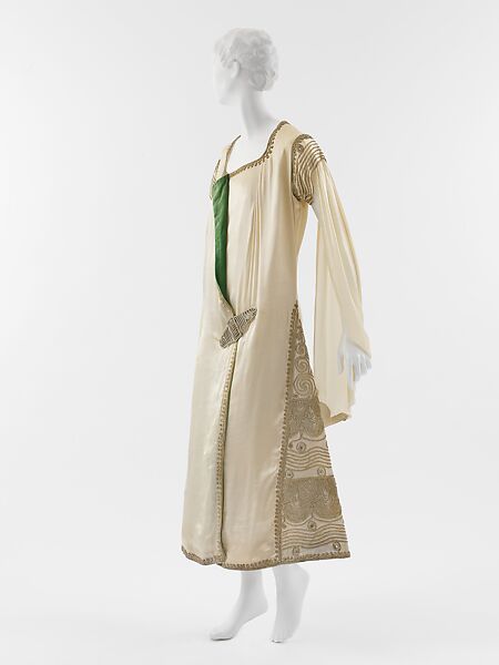 In this short evening dress, Poiret retained defining elements of Middle Eastern dress and also referred to Mughal attire by inserting rigid, heavily embroidered triangular godets at either side of the skirt. The crisp outline characteristic of Mughal and Ottoman styles is subverted, however, by his use of a supple silk satin that drapes softly over the torso. Typical of Poiret’s inventiveness is his reconstruction of the basic shaping of an Indian man’s angarkha, or fitted coat, by substituting for its tight sleeves the sheer sleeves and flaring cuffs that are more commonly seen in Middle Eastern and Ottoman sources.