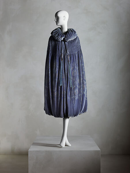 This work of art is currently on loan to the museum.Gallenga was more inclined than Fortuny to create garments whose cut reflected contemporaneous fashion trends, suggesting she was less concerned with conveying notions of timelessness in her work. Rather, her references to the past seem intended to endow her fashions with traces of the artistic ingenuity and superb handcraft of earlier eras. This cape’s printed pattern of animals set among oversize palmettes was borrowed from a late fourteenth-century Italian figured silk that was published in a 1913 study of silk textiles by art historian Otto von Falke. The cape’s silhouette, however, represents a mid-1920s trend for evening capes with high gathered and padded “Medici” collars. Early twentieth-century velvets, unlike their Renaissance predecessors, could be mass produced and were more widely accessible. Although the starting point for her creations was an industrial product, Gallenga preserved a feeling of luxury and distinctiveness through her hand-printed designs, executed on precut fabric to ensure the printed pattern harmonized with the shaping of the garment.