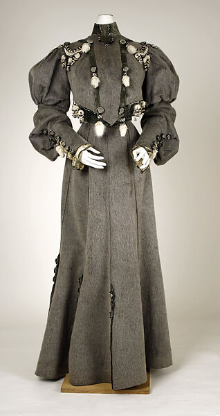 Dashing and more than mildly ostentatious, an embellished plush dress provides warmth in accompaniment to Belle Epoque flamboyance. As the wool plush is itself a hyperbole of velvet and wool, relishing the extended pile and tactile effect, it lends itself to such jaunty and garish stylization.