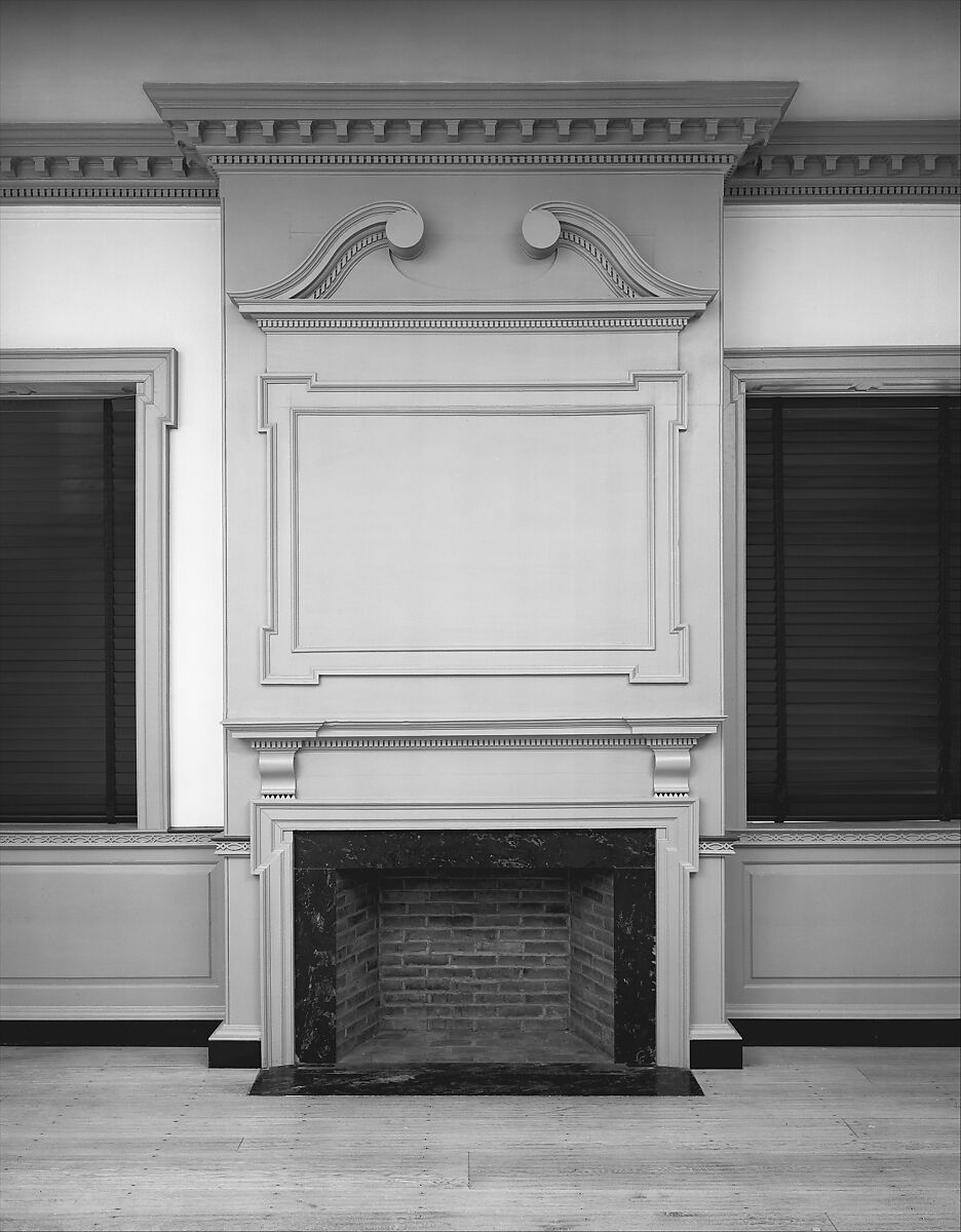 Though it was the site of refined entertainments, the whitewashed walls and chair-rail-high dados reflected the practical side of the room's prominence. Higher up, away from the scuffs and kicks of hands and feet, the room's richly carved ornament is ordered, almost perfectly symmetrical, and reflects the principals and motifs of Georgian decoration despite its late date. The scrolled pediments over the doors and mantles, the crossetted moldings that embellish the doorways, windows, and mantles, the fretwork chair rail, and the dentil-molded cornice are similar to examples popularized by English pattern books of the 1740s and 1750s. The room's two chimney-breasts are a simplified version of Plate L from Abraham Swan's The British Architect (1758). Though Swan was most popular in the colonies in the period preceding the Revolution, his classically inspired designs adhering to the tenets of Georgian decoration remained in use in the decades following independence.