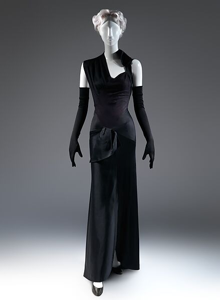 In the postwar period James was increasingly drawn to the muted sophistication of contrasting materials of differing luster. In this evening dress’s monochromatic duet of blacks, the dull sheen of jersey juxtaposes with the high shine of satin. Only after the eye has absorbed the nuanced surface contrasts is the rich geometry revealed. James eliminated the side seams, and the angled satin panel that constitutes the front bodice wraps over the shoulder to form an oblique panel across the back, resulting in an astonishing exposure of skin. Bill Cunningham likened this spiral of inky black fabrics to a stick of licorice.