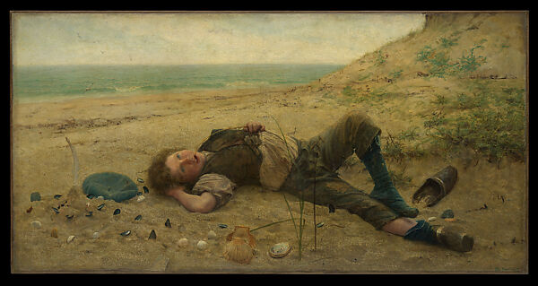 Harrison painted this picture in Pont-Aven, an artist's colony in Brittany. After making preliminary studies on the beach six kilometers away, he dumped two cartloads of sand in the courtyard of his studio in the village and completed the painting outdoors. The painting was exhibited at the Paris Salon of 1882, where it was the artist's first success. The painter Jules Bastien-Lepage admired its plein-air realism and, as a result, sought Harrison's friendship. The subject may have been inspired by an 1877 poem by Henry Wadsworth Longfellow, "Castles in Spain," which describes the optimistic daydreams of youth. Longfellow died in 1882, the year Harrison completed the painting. Between 1882 and 1884, there were a number of other paintings produced by other artists having this same title.