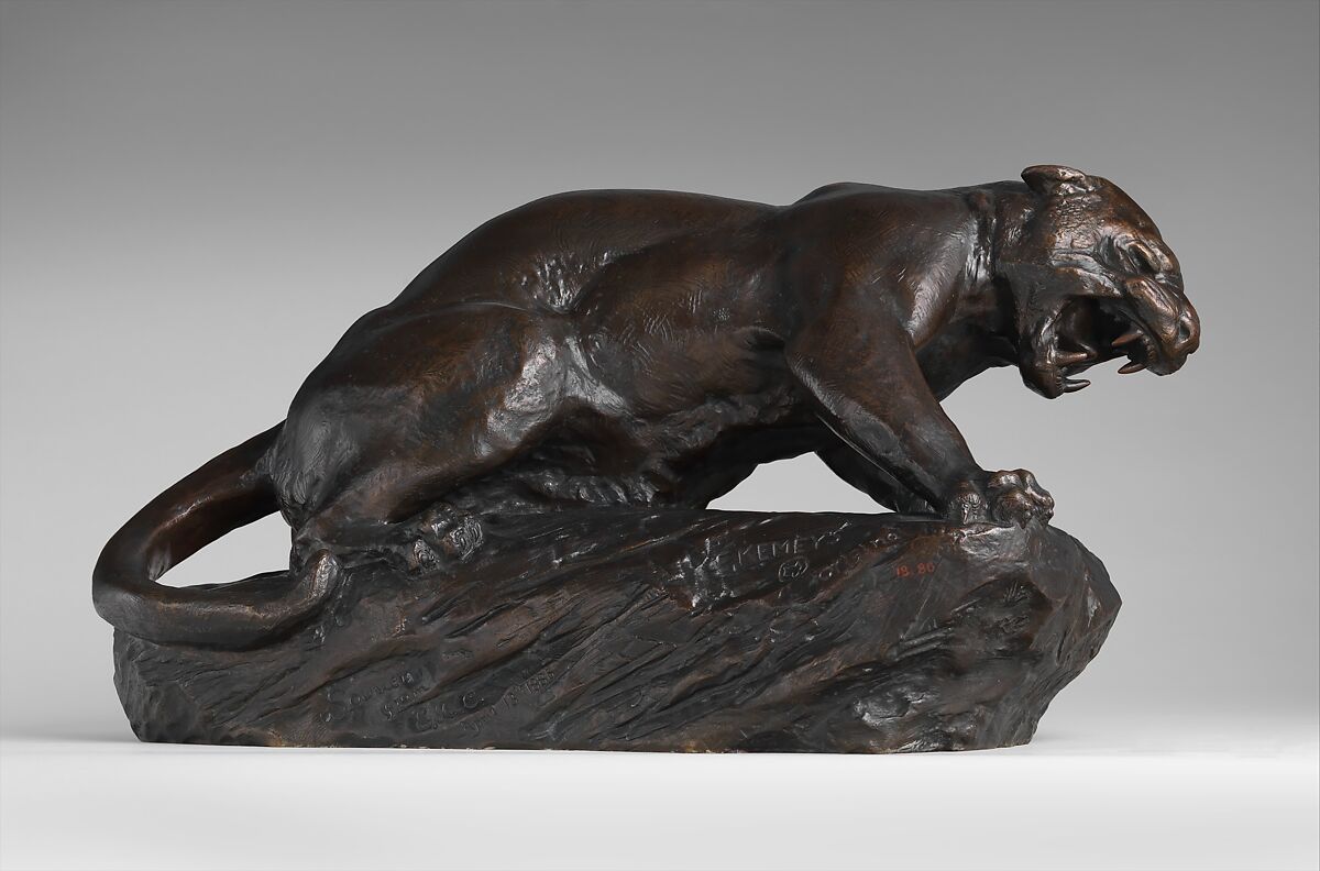 America’s first animal sculptor, Kemeys studied his subjects in their native habitat during several expeditions to the American West. Here, the snarling beast resembles a coiled spring ready to propel itself toward an unknown threat. The enormous fangs, flexed tongue, flattened ears, and articulated claws digging into the rock produce an intimidating effect. The mark visible on many of Kemeys’s bronzes, a wolf’s head, is located near his signature.