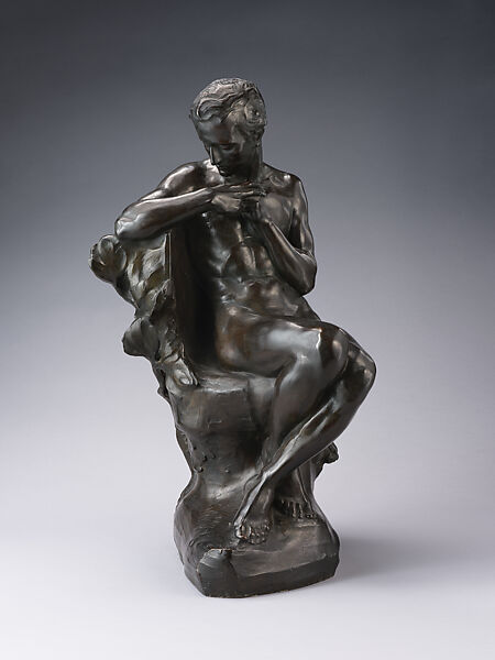 “Genius of Immortality,” probably the most familiar of Konti's ideal sculptures, is personified by a seated, contemplative youth, his eyes downcast and his hands folded. The Metropolitan Museum purchased this bronze statuette in 1916 through the Gorham Company in New York, one of at least an edition of six cast by Roman Bronze Works between 1912 and 1918. Konti was later commissioned by Mrs. Edgar John Lownes to make a large bronze version of the sculpture, to be placed on her husband’s grave in Swan Point Cemetery, Providence, Rhode Island. Konti added to the figure broad wings, supported by a marble entablature flanked by a pair of relief plaques of angels.