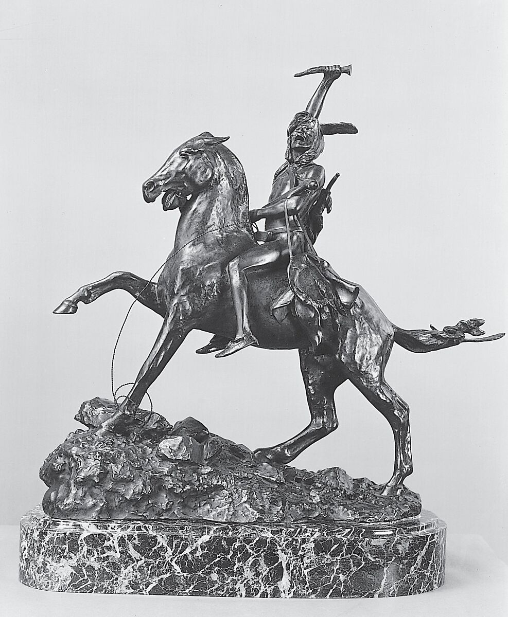 Remington’s fourth bronze, and his first of a Native American subject, was copyrighted in December 1898 as “The Triumph.” The more common title, “The Scalp,” refers specifically to the lock of hair that the figure, mounted bareback on a horse, holds aloft in his right fist. The Metropolitan’s bronze is almost certainly a posthumous, unauthorized cast done by Roman Bronze Works.
