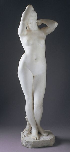 Ruckstull intended “Evening” to portray an ideal, rather than a specific being. It illustrates his observation that “[e]verything in nature folds at evening.” The voluptuous figure in a contrapposto stance tucks her face under her raised, bent right arm, and her drowsy, distant expression suggests the approach of sleep.