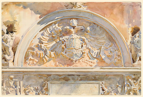 The escutcheon represents the heraldic insignia of Emperor Charles V of Spain. It is located on a fountain on the exterior fortification walls of the Alhambra in Granada, Spain, where Sargent painted in 1912.