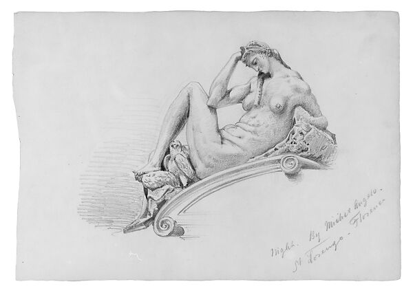 Sargent was born in Florence to American parents and spent much of his childhood in Italy. As an aspiring young painter, he understood that the study of the works of the great artists were essential to his artistic education. Sargent particularly admired the Renaissance master Michelangelo, whose presence was felt throughout Florence, where Sargent lived with his family in the late 1860s and early 1870s. Sargent made this sketch after Michelangelo’s Night (1519–34), on the tomb of Giuliano de Medici in the Medici Chapel in the church of San Lorenzo, Florence, when he was just fourteen years old. Traces of adjusted contour lines suggest that the young Sargent had some trouble rendering Night’s difficult pose: he elongated her twisted torso and struggled to portray her left foot, arms, and head.