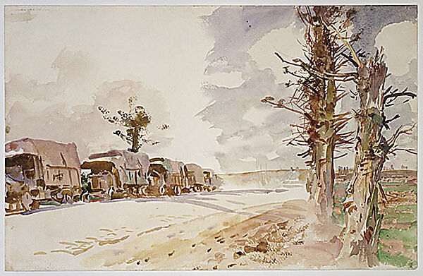 In June 1918, Sargent traveled to France as an official war artist for the British government. Commissioned to paint a picture commemorating the joint efforts of American and British troops, he spent four months along the Front, sketching and painting in watercolor as he searched for a subject. This watercolor is a study for the painting The Arrival of American Troops at the Front (Gilcrease Museum, Tulsa, Oklahoma). Sargent planned the general setting for that composition, including the convoy and shattered trees. His bravura watercolor technique is evident in his rendering of the mottled bark and damaged branches of the trees.