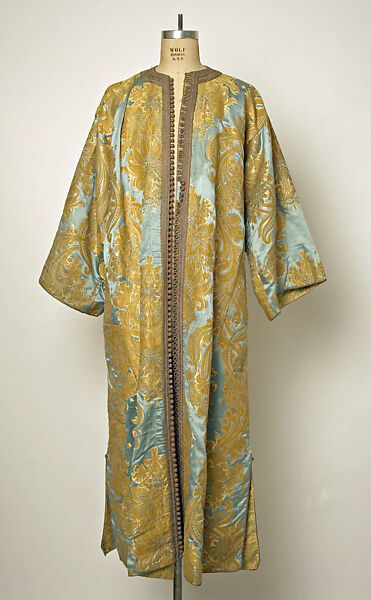 The type of garment referred to as kaftan was known in Persia and the Ottoman Empire before arriving in Morocco, probably in the 16th century. Kaftans are typically worn with fabric belts, and those made of elegant materials such as silk brocade or velvet were reserved for special occasions. The large scale floral designs on the present example are akin to the most sumptuous textiles produced in the Ottoman empire. By the 19th-20th century, Morocco was importing luxury fabric from Lyons, France, and this garment was likely made for an elite and cosmopolitan member of urban Moroccan society.