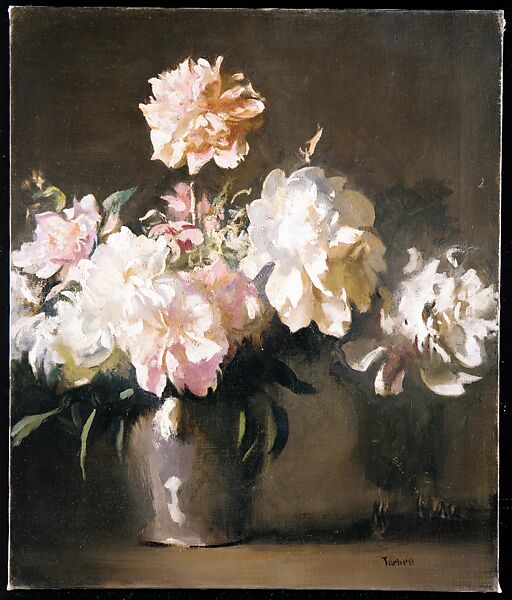 In 1925 Tarbell retired to his summer home in New Hampshire, where he painted a number of still lifes of the pink and white peonies that grew in his garden. This is the most expressive of those late works, possibly inspired by the ongoing popularity of floral paintings by French artists such as Edouard Manet and Henri Fantin-Latour. Tarbell initially included a Chinese figurine on the far right of this composition—likely to underscore the peony’s association with East Asian culture—but then loosely brushed a blossom over it, a change that remains visible.