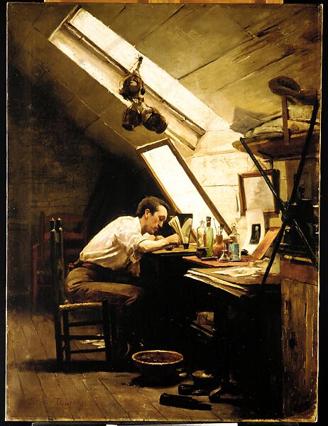 Having first studied in Boston, Tolman pursued further training in Paris, at the Académie Julian and the École des Beaux-Arts, from 1884 to 1886. The Etcher shares the French academic interest in portrayals of artists at work. It depicts Tolman’s friend and fellow student William H. Bicknell (1860–1947), probably in the Boston studio shared by the two artists. Bicknell is shown etching, working from a mirror that reflects a page of the book propped up to his left. A translucent screen diffuses light from the dormer overhead. The hanging wine bottles add a note of levity to the scene of artistic concentration.