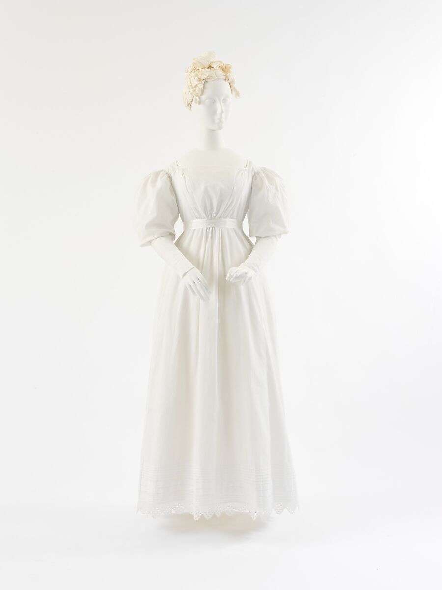 The luxury such an undergarment embodies is as much in the nature of its maintenance as its construction: a substantial staff was required to press and launder linens and whites that were so easily sullied and wrinkled. As with the immaculately starched neckpieces of George "Beau" Brummell, this white cotton underdress was status masked as simplicity and seemingly self-effacing modesty.