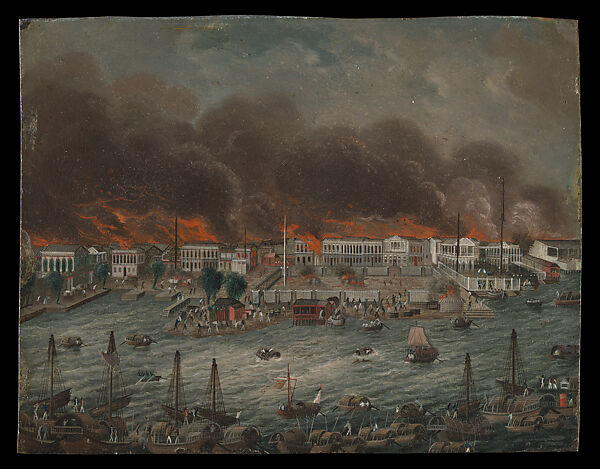 Here, you see an oil on copper painting showing a set of factories. These are the Hongs, which were heavily regulated trading sites in Canton. They’re on fire, reminding viewers of Chinese officials’ attempts to seize and burn the opium being brought by merchants from the West just before the Opium War.