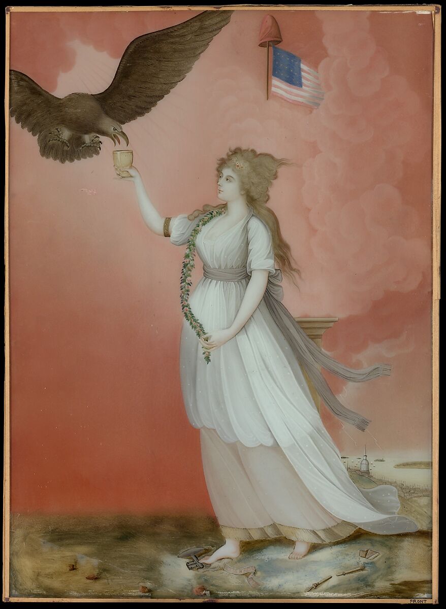 During the Federal period, America’s growing strength and sense of self inspired countless images celebrating the new nation’s ideal of liberty, of which this painting, Liberty in the Form of the Goddess of Youth Giving Support to the Bald Eagle, is one example. Reverse painted on glass for the American market, the image is based upon a 1796 engraving of the same title by Edward Savage of Philadelphia. One of several surviving examples of this popular image, the painting depicts the Goddess of Liberty standing, supposedly, on Beacon Hill, with Boston Harbor in the distance, a reference to the recent evacuation of the British fleet from the harbor. As Liberty proffers a cup to the descending eagle, she tramples below her feet both the key to the Bastille, symbolizing the death of the monarchy in France, and the Star of the Order of the Garter of Britain, symbolizing America’s freedom from England.