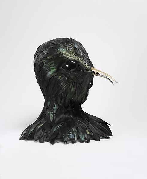 The Costume Institute commissioned this mask for the 2006 exhibition "Anglomania: Tradition and Transgression in British Fashion." Milliner Stephen Jones was given the problem of creating a headdress for a Christian Dior Haute Couture gown by John Galliano (a designer whose long-standing collaborative relationship with Stephen Jones, on both his own line and that of the House of Dior prompted the choice of milliner). The gown, of black silk, had been inspired by Marchesa Luisa Casati, the early-twentieth-century style icon and eccentric, and was to be shown in the Croome Court Tapestry Room in the English Period Rooms. The curator's conceit was to express a Francophilic phenomenon by placing the French dress by a British designer in the English room with Gobelins tapestries. The room with its avian subjects had been commissioned by George William, the sixth Earl of Coventry. His wife, the actress Maria Gunning, was a great Regency beauty and notorious narcissist who died of poisoning from the lead in her pallor-enhancing face powder. Jones's response to this pairing of the narratives of "death by vanity" and of the room's décor was to transfigure the voluminous black gown with a surreal anthropomorphizing of the bird motif and associate it with a portent of death, a crow's head. Jones's whimsy appears in his incorporation of an inexpensive metal hairclip for the bird's beak.