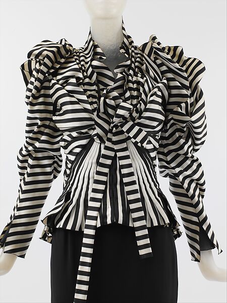 In some instances-exceptions to her practice of purchasing a total runway "look" from head to toe-Mrs. Kempner would acquire a single item, often a jacket or blouse. She articulated her approach in Vogue: "I regard clothes as an investment. I collect pieces that work together with what I already have in my wardrobe." A spectacular Christian Lacroix bodice is an example of this strategy of adding an important accent piece to extend the possibilities of her wardrobe. The bodice is a particularly masterful construction of mitered stripes and complex draping. A signature Lacroix work, its full gigot sleeves, narrowly fitted waist, and vestigial peplum represent both the designer's technical virtuosity, and his historicizing impulses.