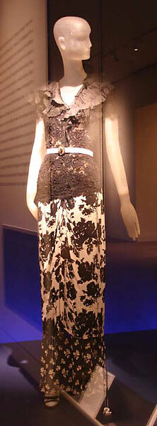 Despite the preponderance of plain and unpatterned, albeit luxurious, textiles in her wardrobe, Mrs. Kempner on occasion selected the more hyper-feminized impact of delicate lacework or opulently printed silks. The Christian Lacroix gown, with its collage of sumptuous lace and silks of different weights and weaves, retains the couturier's signature interest in rich textural juxtapositions. On the other hand, Mrs. Kempner's selection of a model leached of the bright colors for which the designer is also known and of a narrow silhouette with which he is even less associated suggests the eye of a client who is able to select from a collection the specific models that conform to the parameters of her clearly identifiable aesthetic.