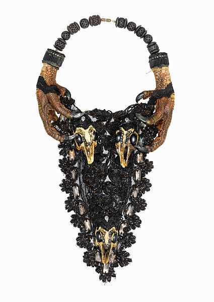"The 'Memento Mori' necklace was inspired by À Rebours. In the novel there is a description of an extravagant dinner that the hero holds to mourn the temporary loss of his virility. It is an all-black feast featuring 'Turtle soup, Russian rye bread, ripe olives from Turkey, caviare, mullet botargo, black puddings from Frankfurt, game served in sauces the colour of liquorice and boot-polish, truffle jellies, chocolate creams, plum-puddings and black heart cherries.' I imagined myself a guest at the feast and created the necklace as a suitable adornment. It is formed from rotting Victorian jet, skulls, and a pair of huge talons. Many years later I went on to wear the piece at the first of an ongoing series of all-black banquets held every two years and entitled 'Dine with Death.'"