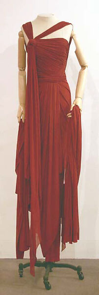 Although her loyalty to Yves Saint Laurent, Valentino, and Oscar de la Renta is revealed by their quantitative representation in Mrs. Kempner's collection, she was enthralled by the work of Mme Grès in the 1960s and 1970s. She noted in the New York Times for October 10, 1979, "I have Grès dresses going back twenty years. I use them like a library." Mrs. Kempner's small number of pieces, at least relative to her other favored designers, still comprise a survey of Mme Grès's best efforts. More recently Mrs. Kempner purchased Jean Paul Gaultier's homage to the classic, hand-pleated Mme Grès gown. Gaultier's version, reflective of the times, is deliberately louche, informed as much by the decade of deconstructionists as the heyday of Mme Grès. Gaultier's careful draping is invested with a sense of haphazard spontaneity in the loose ends and unexpected knot that would have been an anathema to his predecessor's precisely controlled designs.