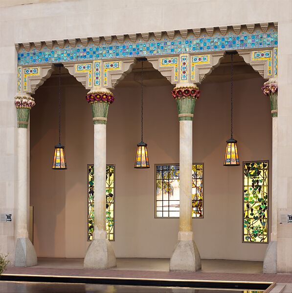 ALICE COONEY FRELINGHUYSEN: Louis Comfort Tiffany designed this four-columned entrance loggia for his own residence, the last house he designed for himself. Called Laurelton Hall, it was situated in Oyster Bay, New York, on a hill overlooking Long Island Sound. The capitals at the top of each column are astonishing for both their exoticismand naturalism. Each glazed-pottery depiction shows a different flower, accurate and easily identifiable as a specific type. From left to right, they are the lotus, dahlia, poppy, and saucer magnolia. Starting from the bottom of each group of flowers, you see the three stages of growth—the bud, the flower in full-bloom, and the seed pod---showing Tiffany’s interest in the cycle of life. The long stems in various shades of green are made of many individual pieces of glass. Tiffany’s mission was in tune with the principles of the Aesthetic Movement. He sought to combine decorative art and architecture, incorporate many sources, and integrate these elements harmoniously with an original artistic sensibility. He accomplished that goal magnificently in this loggia and throughout his extraordinary home. He created a lavish setting, using his own stained-glass windows and lighting fixtures such as the three paneled lanterns you see here. Tiffany incorporated objects from his large and varied collections, which included Japanese prints, Chinese pottery and porcelain, Asian carpets, Roman glass, and Native-American basketry. The windows and paintings of his own design like those seen here display Tiffany’s great love for nature. He also designed hanging gardens with tropical plants, waterfalls, and fountains for the surrounding landscape. Tragically, Laurelton Hall was destroyed by fire in 1957. This loggia is one of the few architectural elements that was salvaged from the fire.