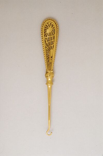 This button hook is an example of Tiffany Studios' etched metal and glass pattern in the pine-needle design. It descended in the family of George Scharffenberger, the accountant/bookkeeper for Tiffany Studios.