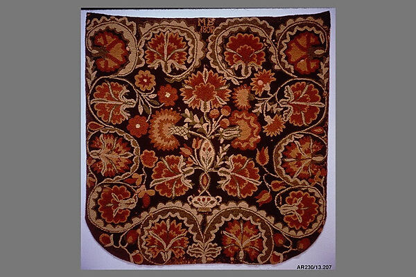 This bed rug is needleworked in looped running stitch, which has been cut to form a pile surface on the light brown/ochre woven wool base. The base is made of three panels of fabric, sewn together at their selvedges. The bed rug is decorated with a central pattern of branching flowers stemming from a single vase, along with a border of large flowers and twisting vines in shades of rust brown, light brown, yellow beige, and moss green with a black background.